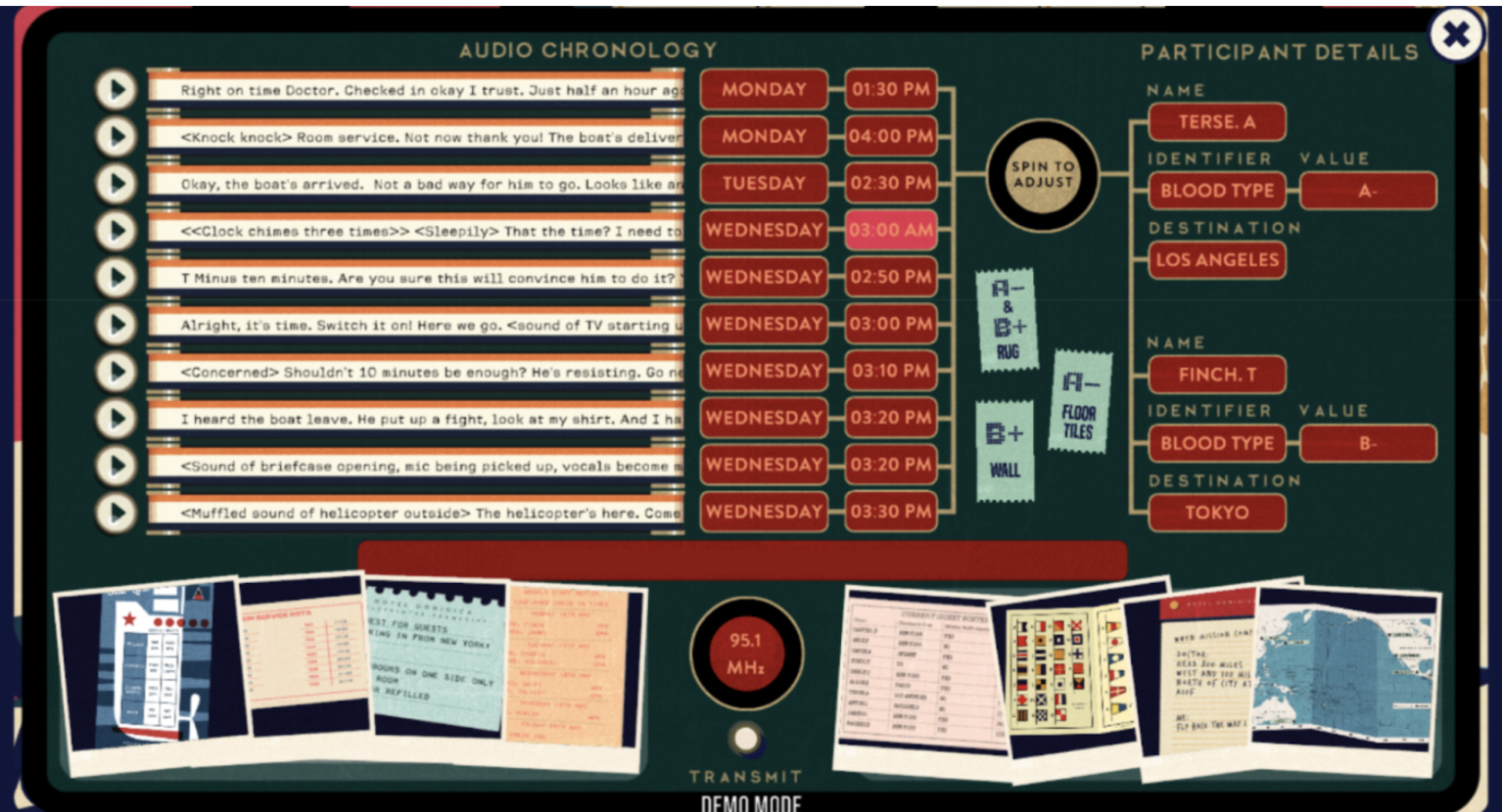 "The audio recordings are between Dr. Finch and Terse, the enemy agent. Terse's blood type is A-, and his destination is Los Angeles. Finch's blood is B-, and he was headed to Tokyo. The recordings start Monday at 1:30pm when the doctor shows up, and end Wednesday at 3:30pm when the helicopter arrives."